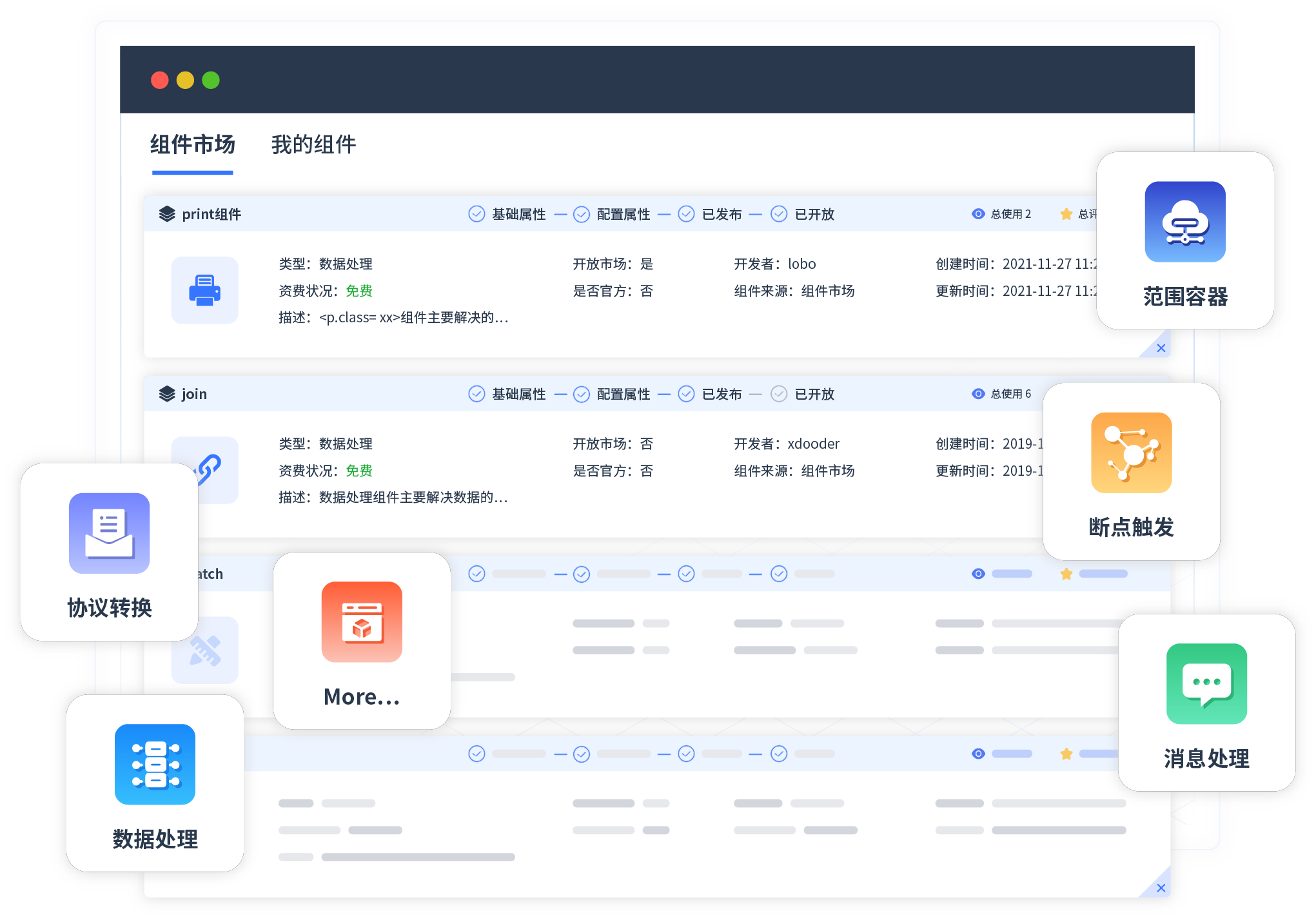 针对集成场景,,,,,,,,,,,,,VIVO钱包提供组件市场,,,,,,,,例如协议转换、、、、、、、、、、、消息处理、、、、、、、、、、、文件操作等。。。。。。。。。。除平台提供的组件外,,,,,,,,,,,,,客户可以自定义所需组件。。。。。