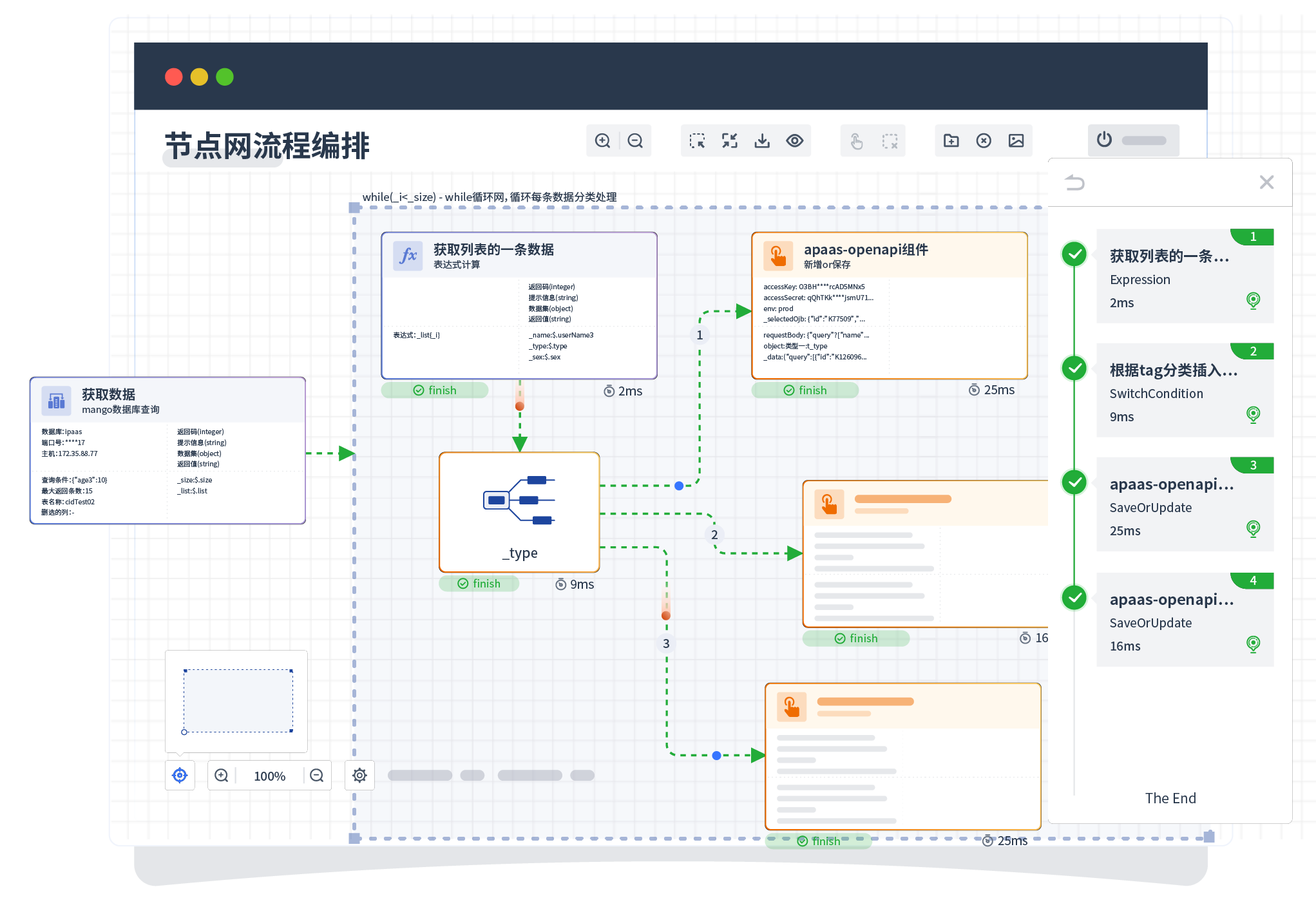 针对集成场景,,,,,,,,,,组件定义后支持进行流程编制,,,,,,,,,,,,不同于传统代码方式,,,,,,,,通过图形化展示,,,,,,,支持在线调试、、、、、日志查看和运行回放。。。。。。。